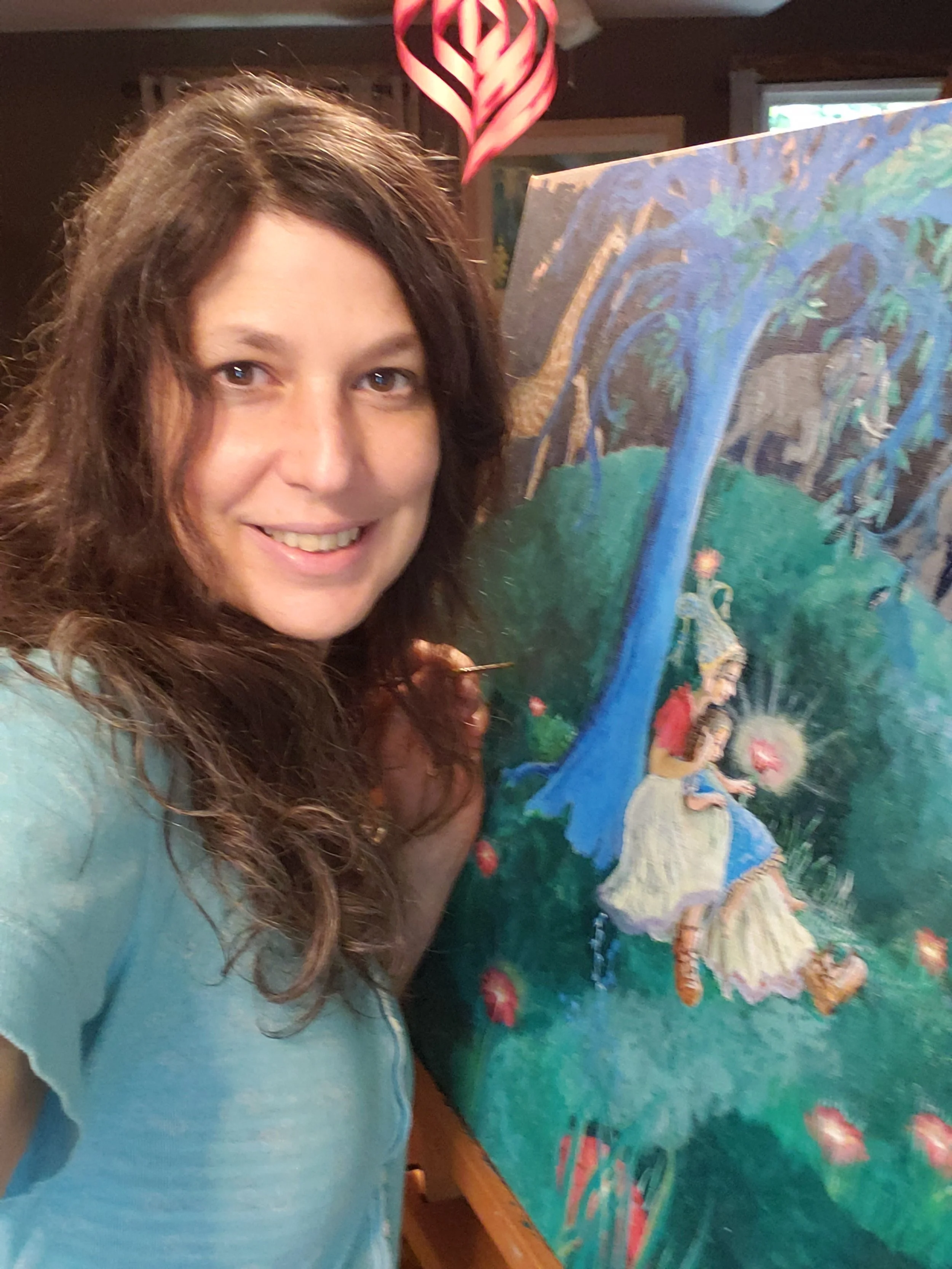 Jenna Herbst discovered in 2020 that she enjoyed drawing with colored pencils, moving slowly over the paper and taking a month or so for each drawing. Then, curious about paint, she started using watercolor and ink to make illustration type work. From there, she wanted brighter, thicker colors, and moved to acrylics, which is what she uses now. Mostly on canvas and sometimes on wood, she creates images from her imagination of how light and joy erupt through our lives and experiences, and also how the transformative element of the heart allows love to come through even the darkest of experience. Her pieces are illustrative, containing elements of magic. The myths and fairytales seemingly generated by imagination are real in the sense that they illustrate the journey of our soul through what is seen with the eyes, and seen with the heart, and the inner senses. Jenna’s other profession of counseling and teaching is also a part of her work, and she is always interested in healing and awakening. She is currently working on writing and illustrating a book (or several books, depending on the day).