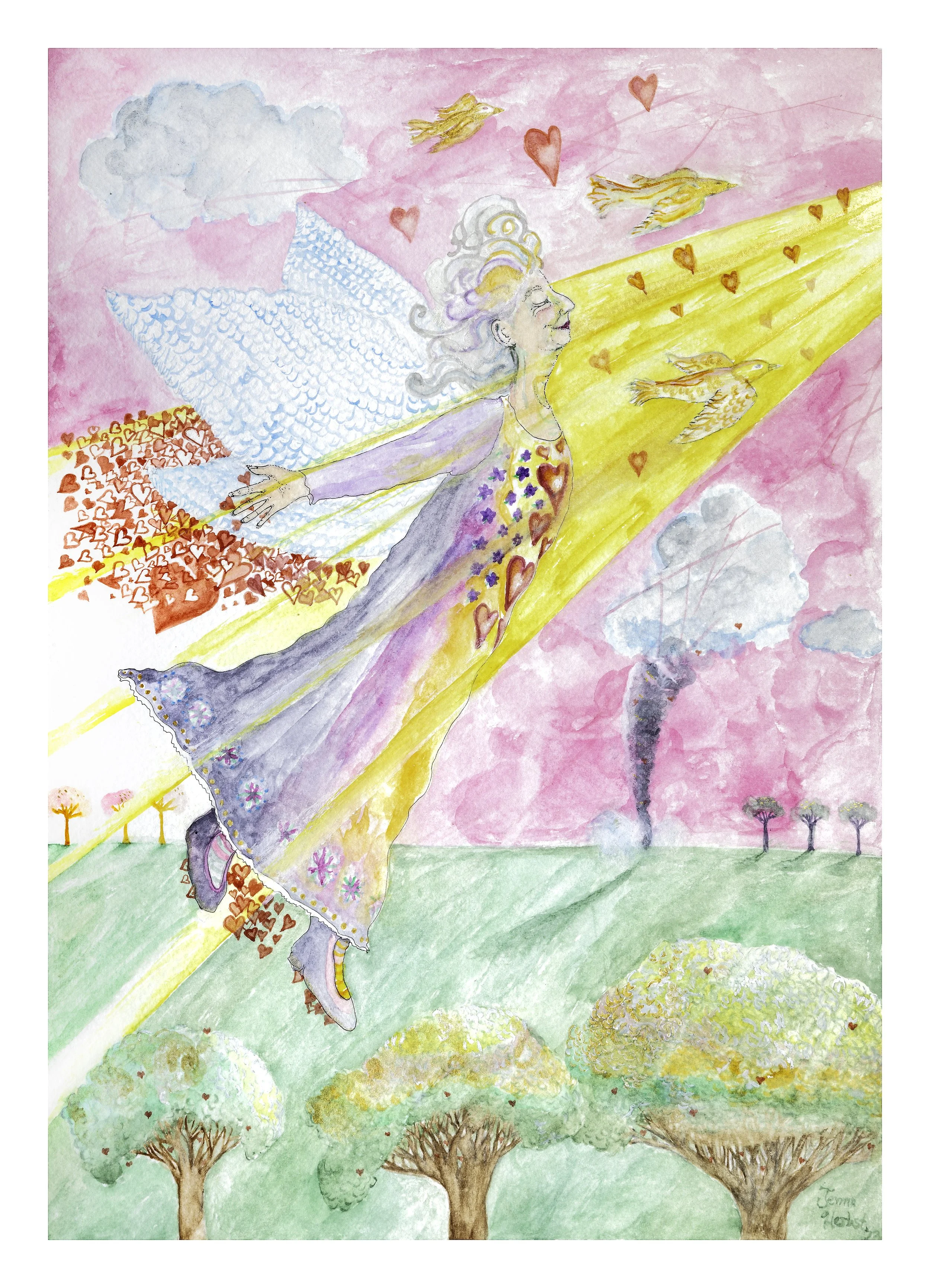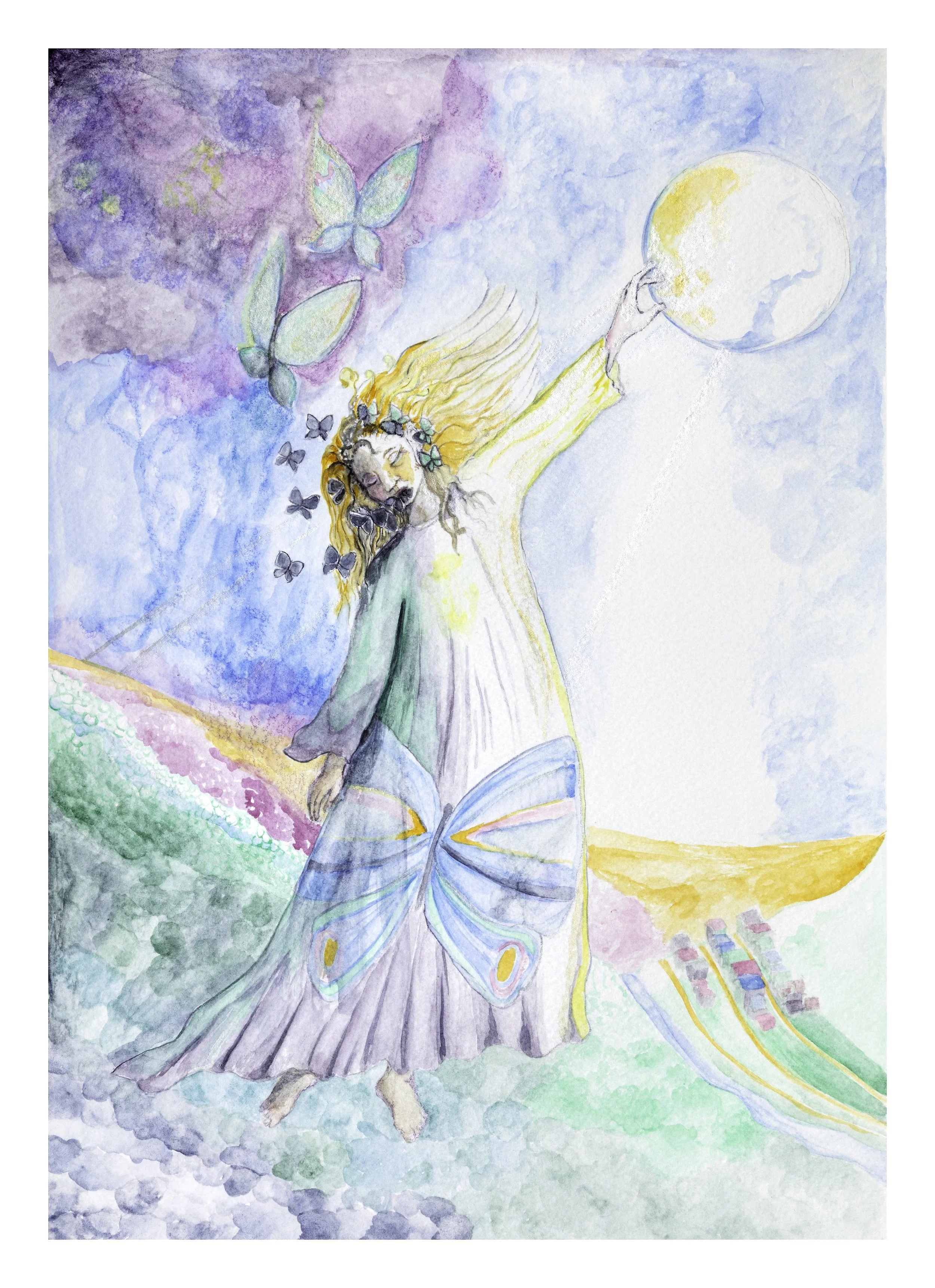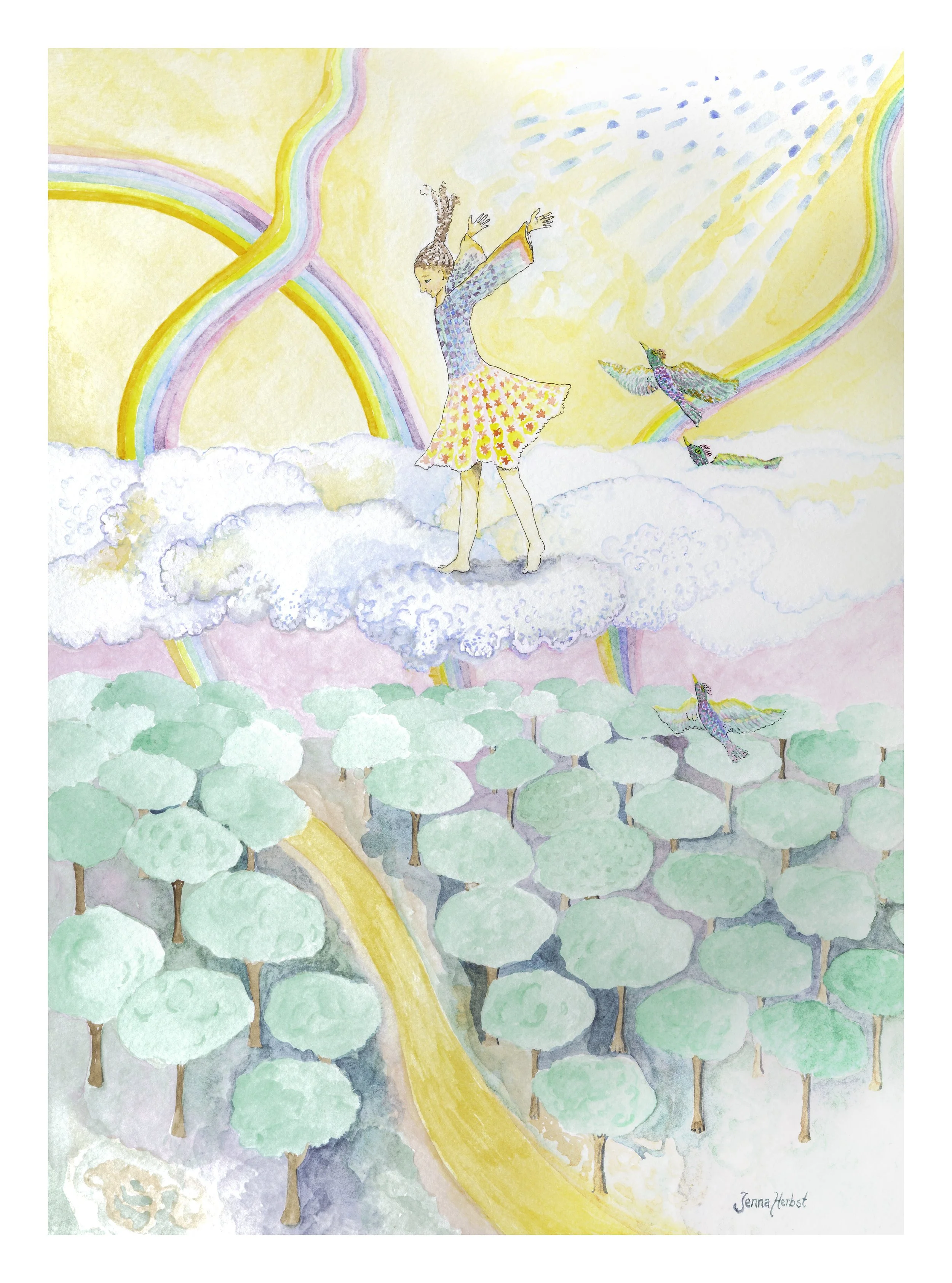 Jenna Herbst discovered in 2020 that she enjoyed drawing with colored pencils, moving slowly over the paper and taking a month or so for each drawing. Then, curious about paint, she started using watercolor and ink to make illustration type work. From there, she wanted brighter, thicker colors, and moved to acrylics, which is what she uses now. Mostly on canvas and sometimes on wood, she creates images from her imagination of how light and joy erupt through our lives and experiences, and also how the transformative element of the heart allows love to come through even the darkest of experience. Her pieces are illustrative, sometimes containing elements of magic. Jenna’s other profession of counseling and teaching informs her work, as she is deeply interested in healing and awakening. She is currently working on writing and illustrating a book.